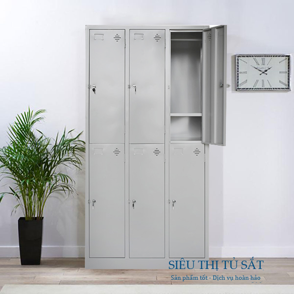 Tủ sắt treo quần áo 6 ngăn dùng cho các khu công nghiệp có số lượng công nhân viên nhiều. Tủ treo quần áo 6 ngăn được chia làm 3 buồng, mỗi buồng 2 tầng, chia làm 6 ngăn đều nhau, có tay nắm, ổ khóa riêng biệt.